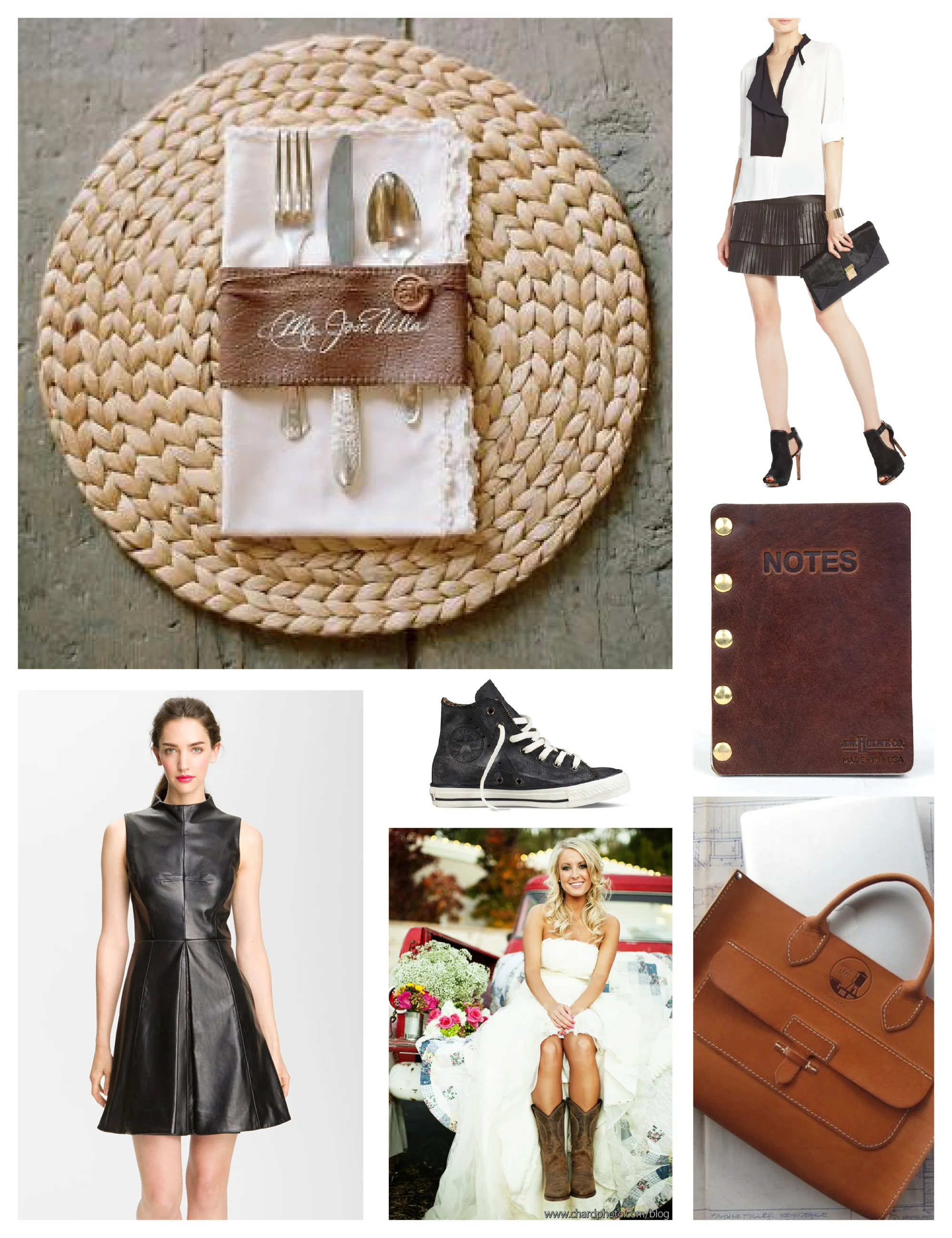 Luxurious Leather. Ever since our Fall 2012 Trend Report we can't seem to get our minds off of leather. Whether it's an edgy pleated mini skirt or chic leather dress, housewares or office essentials, we are seeing this fall trend pop up everywhere. Leather adds a sexy sophisticated feel to any outfit in either small details, like a pair of Chuck Taylors, or take it to the max with this edgy Milly dress. For a classic approach to the trend consider adding one of Spring & Finn Co.'s amazing handbags to your closet for a splash of timeless simplicity. As for the trendy bride, consider featuring the trend on your place settings for an unexpected touch or pairing your wedding dress with cowboy boots. Leather also lends a classic feel in daily essentials from notebooks to wallets. We love this convenient notepad from J.W. Hulme. Whatever way you approach this fall trend you are sure to make a fashion statement that won't go unnoticed.
